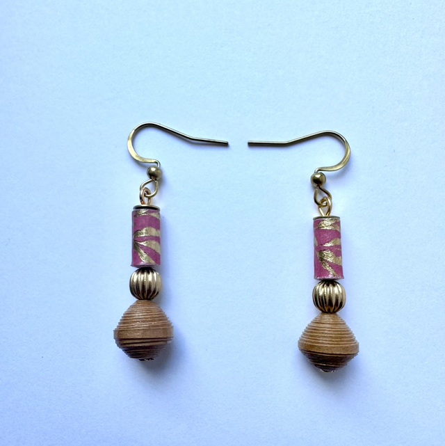 Des boucles d’oreilles uniques qui mêlent une perle longue en papier roulée à la main, une perle dorée texturée et une perle de papier beige.